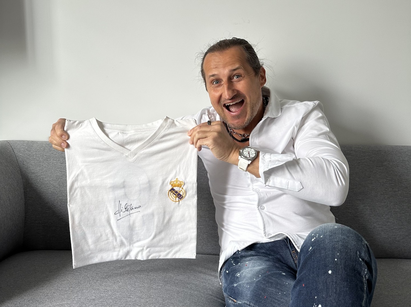 ...postanowiłem pokazać Wam tę koszulkę dzień po zdobyciu mistrzostwa Hiszpanii przez FC Barcelona. Tak trochę dla przekory... Pomimo, że nie jestem zdefiniowanym fanem konkretnie Realu czy FC Barcelona (obie drużyny lubię podobnie, no może Barcę troszkę bardziej od kiedy grają tam Polacy), dla równowagi, po zdobyciu Mistrzostwa przez Barcę, chciałbym Wam zaprezentować koszulkę z podpisem byłego gracza Realu Madryt. Ten "t-shirt" przychodziło mi zdobyć chyba najciężej! Wielki Alfredo di Stefano! Nieżyjący już od prawie 11 lat hiszpański piłkarz argentyńskiego pochodzenia podpisał go jakiś czas temu. On podpisał, a ja upolowałem, chociaż droga do tego była bardzo, bardzo długa. Koszulek z własnoręcznym podpisem tego Wielkiego niegdyś zawodnika znalazłem na świecie dwie, może trzy... To prawdziwy unikat w tej dziedzinie i właśnie ten unikat jest w posiadaniu Hellosport! Poezja...